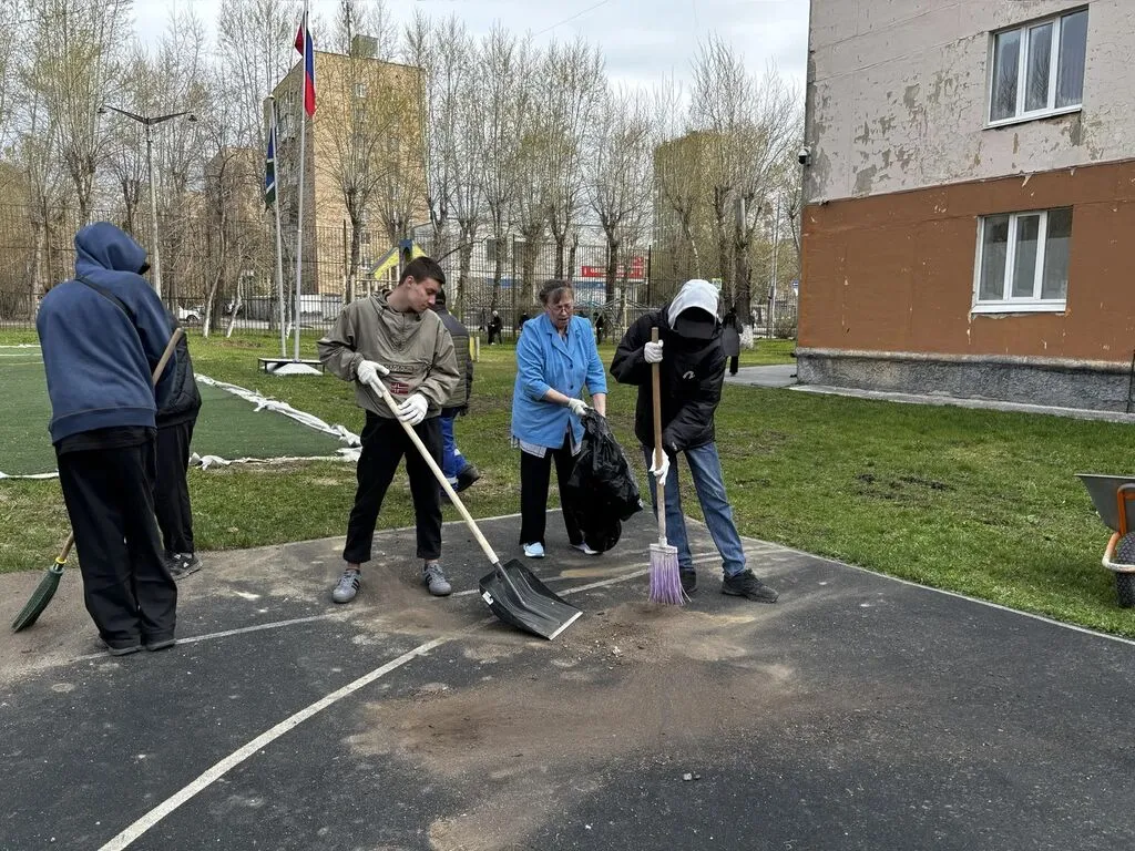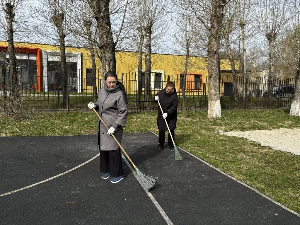 На территории школы: сотрудники и учителя совместно с детьми убирали мусор, собирали прошлогодние листья, подметали дорожки и приводили в порядок клумбы. Ребята помогали и поддерживали друг друга, а учителя координировали работу и поддерживали боевой настрой.